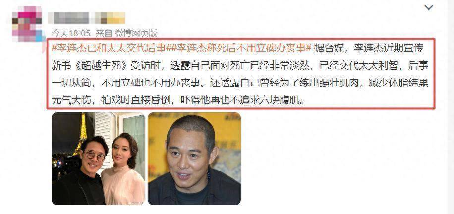 2023年,李连杰在宣传自己的新书时透露,早已立好遗嘱,不立碑不办丧事,一切从简。