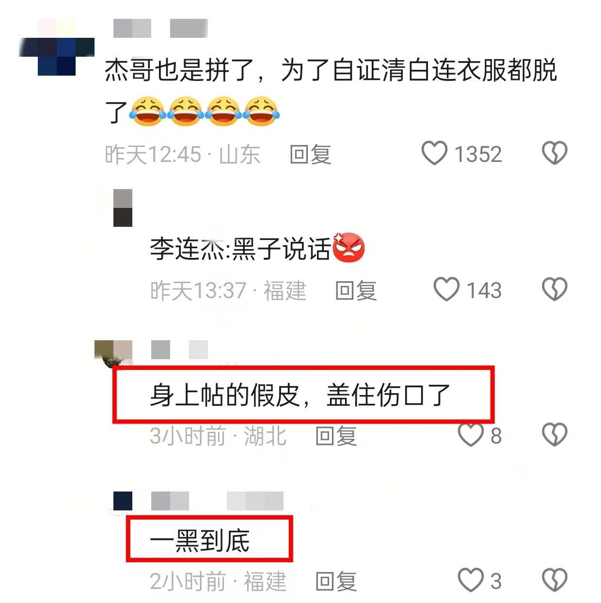 或许是受够了讨论,所以李连杰才站出来自证清白,本以为这下就能止住谣言了,结果,更离谱的评论出现了,身上贴假皮、祛疤技术更进一步、这是以前的视频、胸口抹了遮瑕粉底。