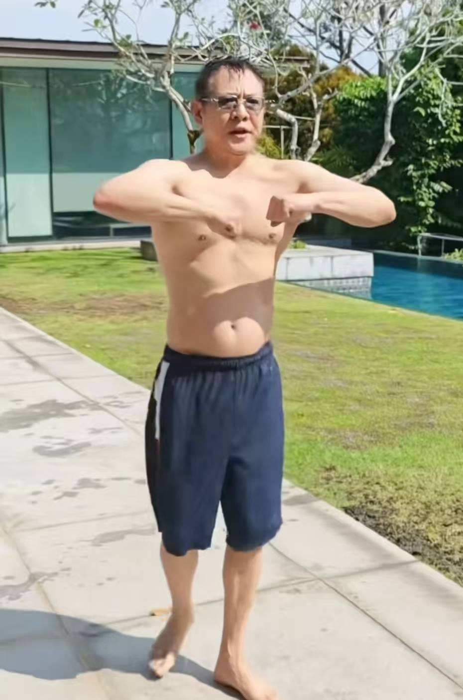 一开始,李连杰先做热身准备,他扭动一下身体,从小腿和胳膊上的肌肉能看出,李连杰平时还是有锻炼保持身材的,但肚子明显凸起,果然,人上了年纪,先胖肚子,李连杰也不例外,不过这大腹便便的样子倒是亲切几分。